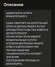 здравствуйте читайте ВНИМАТЕЛЬНО!!!!Сдам Квартиру на длительный срок но делаете РЕМОНТ В СЧЕТ АРЕНДЫ просто живете и вы там делаете ремонтно при этом оплачивать коммунальные услуги и по всем вопросам пишите и звоните отвечу и фото скину реальные при личном общении НАЦИОНАЛЬНОСТЬ не имеет значения ПОСРЕДНИКОВ ПРОСЬБА НЕ БЕСПОКОИТЬ .Предоплата за 1 месяц