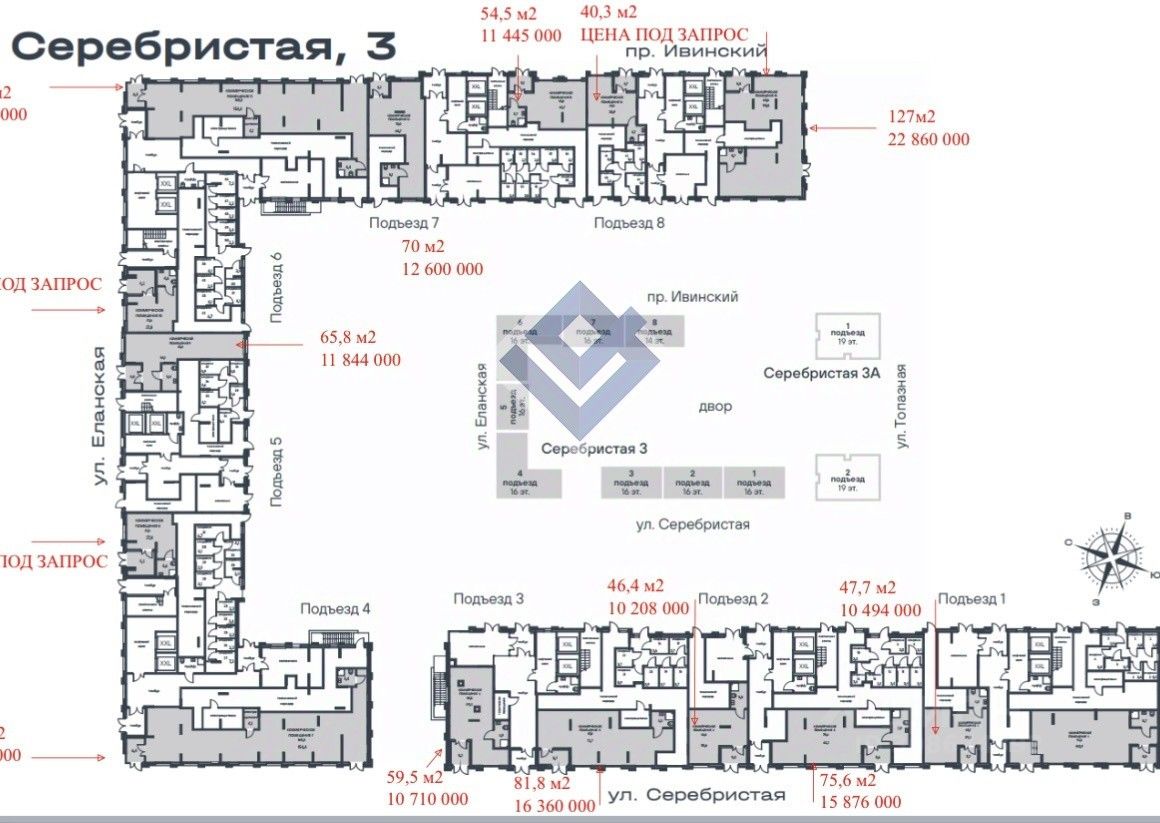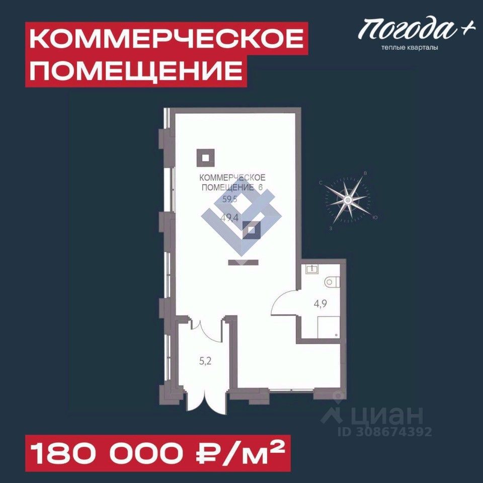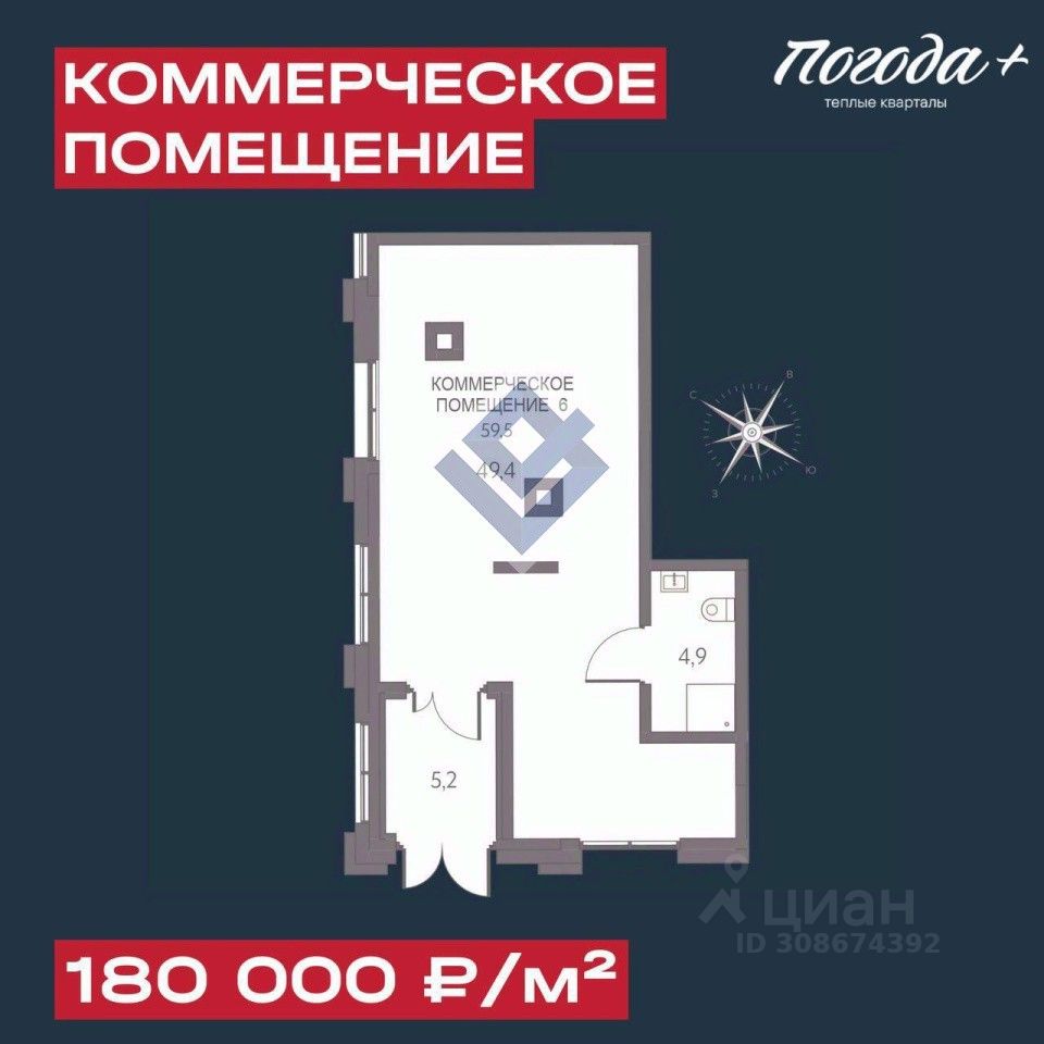 Продается коммерческое помещение площадью 59.50 м2 в в новом жилом комплексе '' Погода'' по адресу ул. Серебристая 3, 3 подъезд. Помещение располагается в торговой галерее дома на 1 этаже с отдельным входом с ул. Серебристая. Высокий пешеходный и автомобильный трафик - более 5 000 семей уже живут в районе и заселение продолжается. Гибкий функционал - помещение адаптируется под разные сценарии: от йога-студии до уютной кофейни. Высокий спрос на услуги - особенно на повседневный сервис: еда, здоровье, спорт, красота. Лучшее предложение для тех, кто рассматривает покупку как инвестицию или планирует открыть бизнес в районе с уже сформированным спросом! В торговой галерее так же доступны к продаже коммерческие помещения под любой вид бизнеса площадью от 54 до 194 м2.