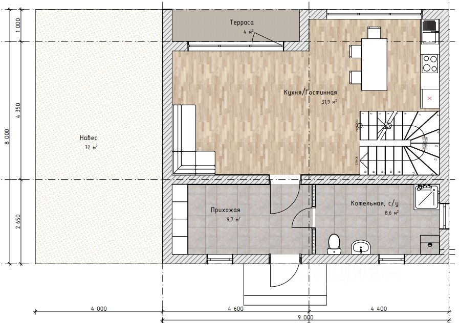 Стены: полистирол-бетон 300 мм с декоративной штукатуркой.