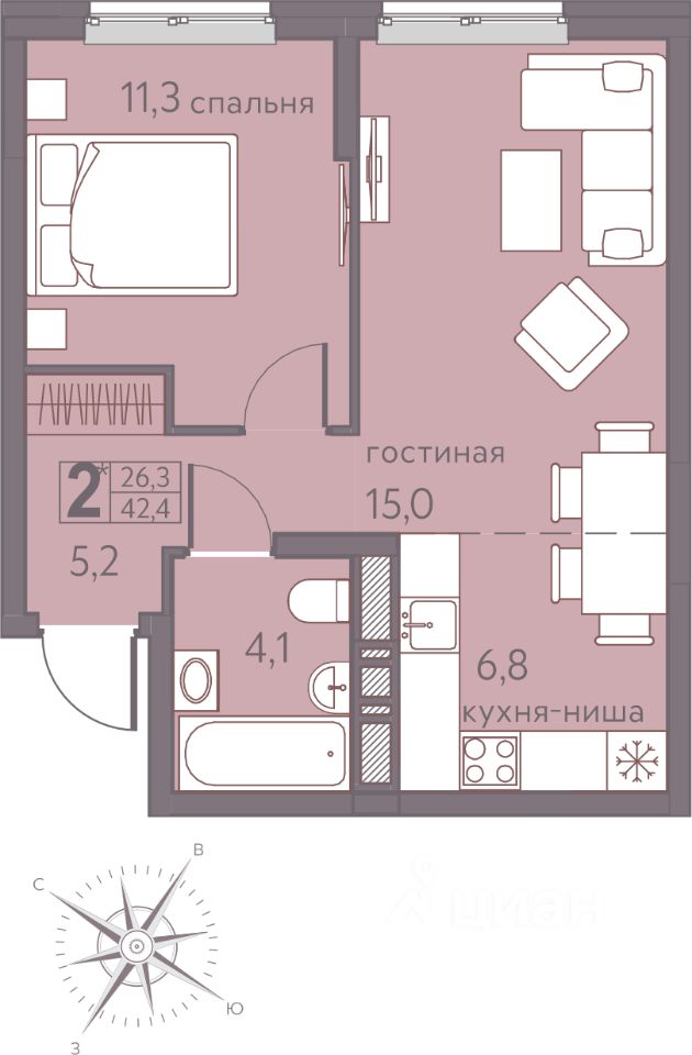 Продаётся студия в строящемся доме (Серебристая, 5), срок сдачи: I-кв. 2026, общей площадью 42.4 кв.м., на 11 этаже. Теплые кварталы ''Погода'' — это новый грандиозный проект от создателя Спортивного микрорайона ''Ива'', федерального застройщика ''Девелопмент-Юг'' .