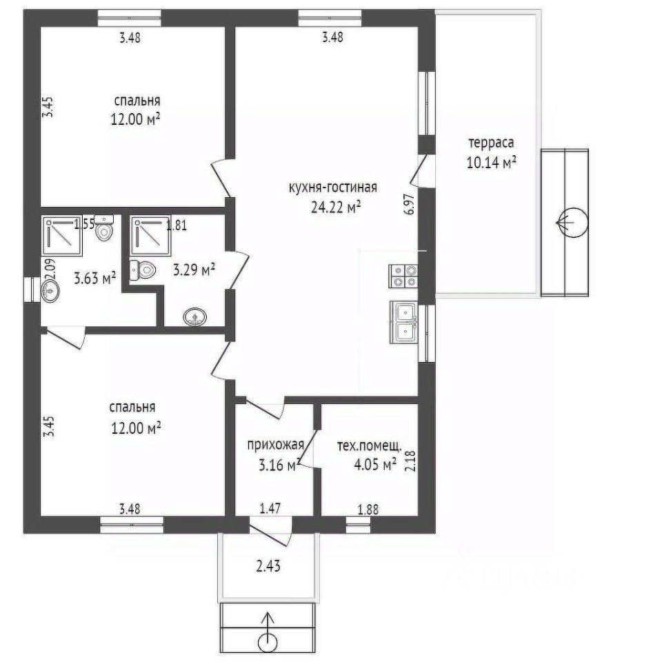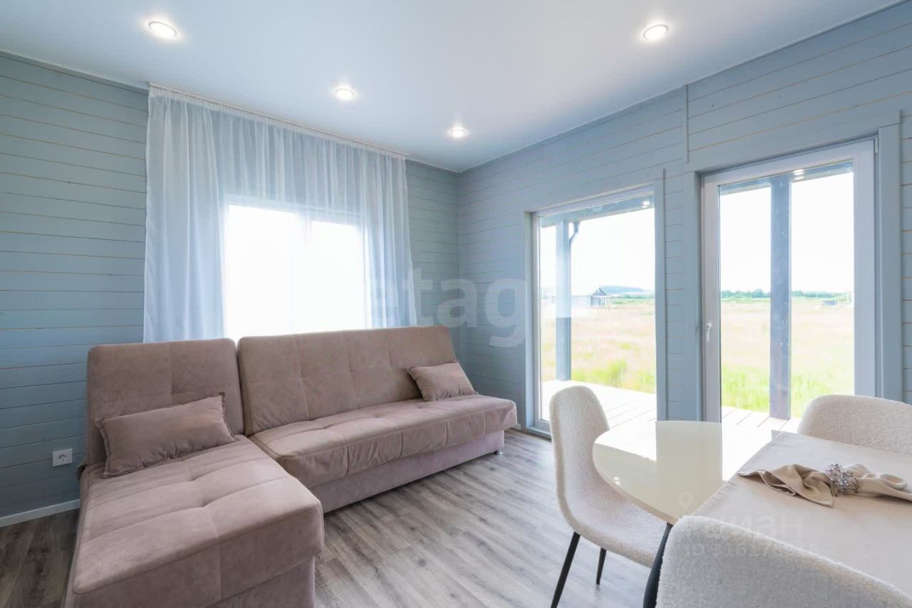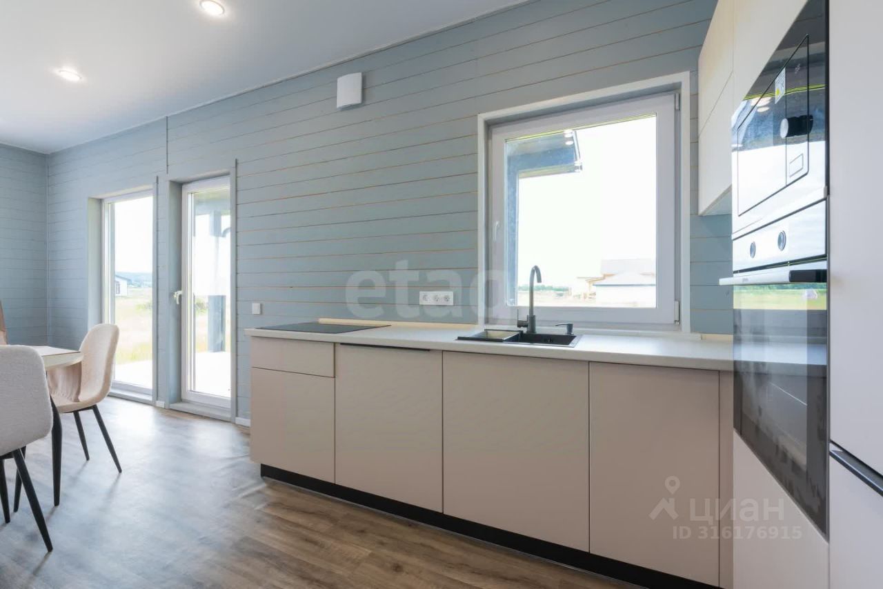Готовый дом 74,9 кв.м. стильный и одновременно функциональный, эргономичная и очень продуманная планировка: совмещенная кухня-гостиная с панорамным остеклением и выходом на собственную террасу 10 кв. м., 2 спальные комнаты, одна из которых со своим отдельным санузлом (мастер-спальня), второй санузел и отдельное помещение для котельной, оконные проемы с низкими подоконниками.
