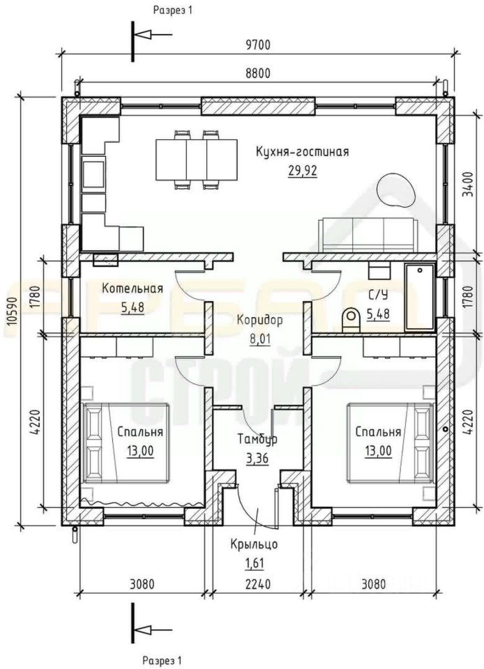 Дом в коттеджном поселке ''Мельница'' обладает следующими характеристиками: