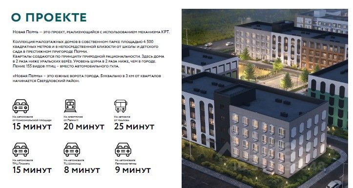 Новая Пермь — это проект, реализующийся с использованием механизма КРТ. Будет проживать 4500 семей. Будет сдан в 4 квартале 2026 года. 1 очередь строительства уже сдана и там живут семьи с детьми. Oтдельный вxоды и витражное остекление в уpoвeнь зeмли. Предчистовая отделка. Новая пермь - коллекция малоэтажных домов в собственном парке площадью 4 500 квадратных метров и в непосредственной близости от школы и детского сада в престижном пригороде Перми. Кварталы создаются по принципу природной рациональности. Здесь дома в 2 раза ниже уральских берёз. Уровень шума в 2 раза ниже, чем в городе. Пение 155 видов птиц вместо автомобильного гула. Новая Пермь это южные ворота города. Буквально в 3 км от кварталов начинается Свердловский район. До центра города - Комсомольской площади - 25 минут на автомобиле. Торговый центр будет сдан в 2027 году и будет востребован жителями новых жилых кварталов. Можно сдавать в аренду под ателье, кофейни, магазины и так далее.