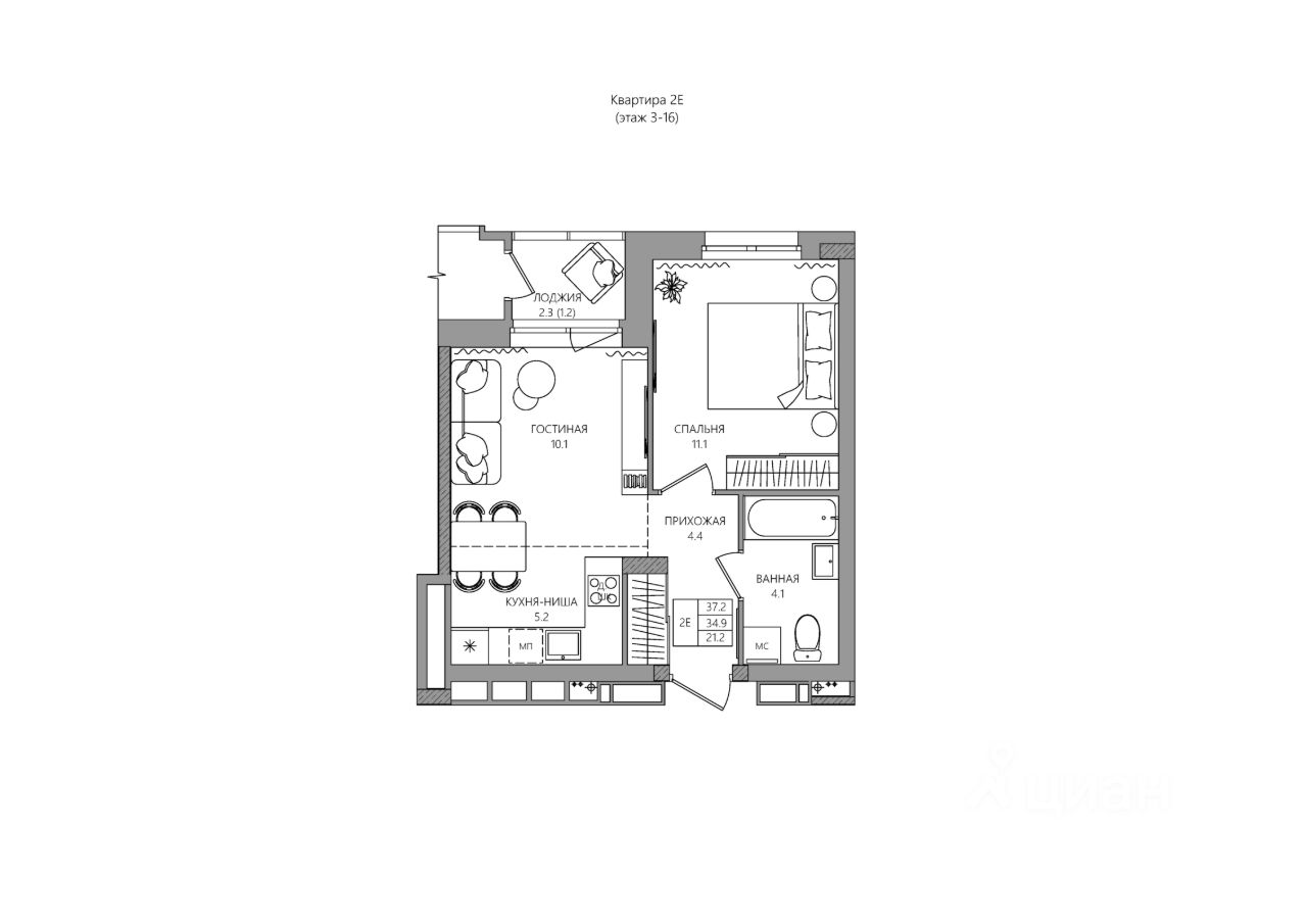 Жилая площадь21,2 м2