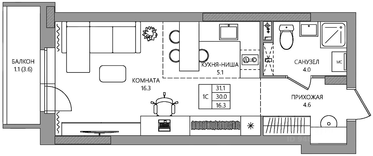 Общая площадь31,1 м2