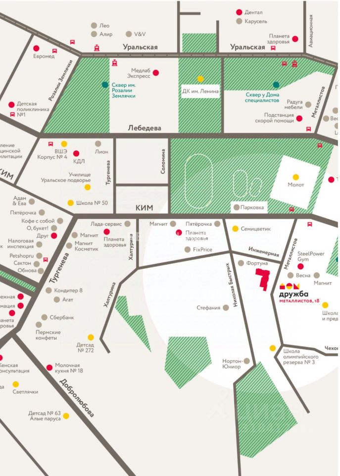 Инфраструктура: 10 минут - Центр города 3 минуты- 282 м Остановка автобусов ''Дворец спорта ''Молот'' 9 минут 737 м - Остановка трамваев ''Дворец культуры имени Ленина'' Детям 2 минуты 180 м - Центр развития ребенка, детский сад, ясли ''Семицветик'' 5 минут 430 м- Детский сад 387 9 минут 740 м - Школа 50 (с углубленным изучением английского языка Продукты 3 минуты 258 м - Супермаркет ''Магнит'' 4 минуты 297 м - Супермаркет ''Пятерочка'' 4 минуты 310 м - Медицинский центр ''Философия красоты и здоровья'' 9 минут 770 м - Ветеринарная клиника ''Друг'' 6 минут 510 м - УДС ''Молот'' Дом 10 этажей: Детская площадка для разных возрастов Высокий класс энергоэффективности A Индивидуальный тепловой пункт Всего 131 кварт