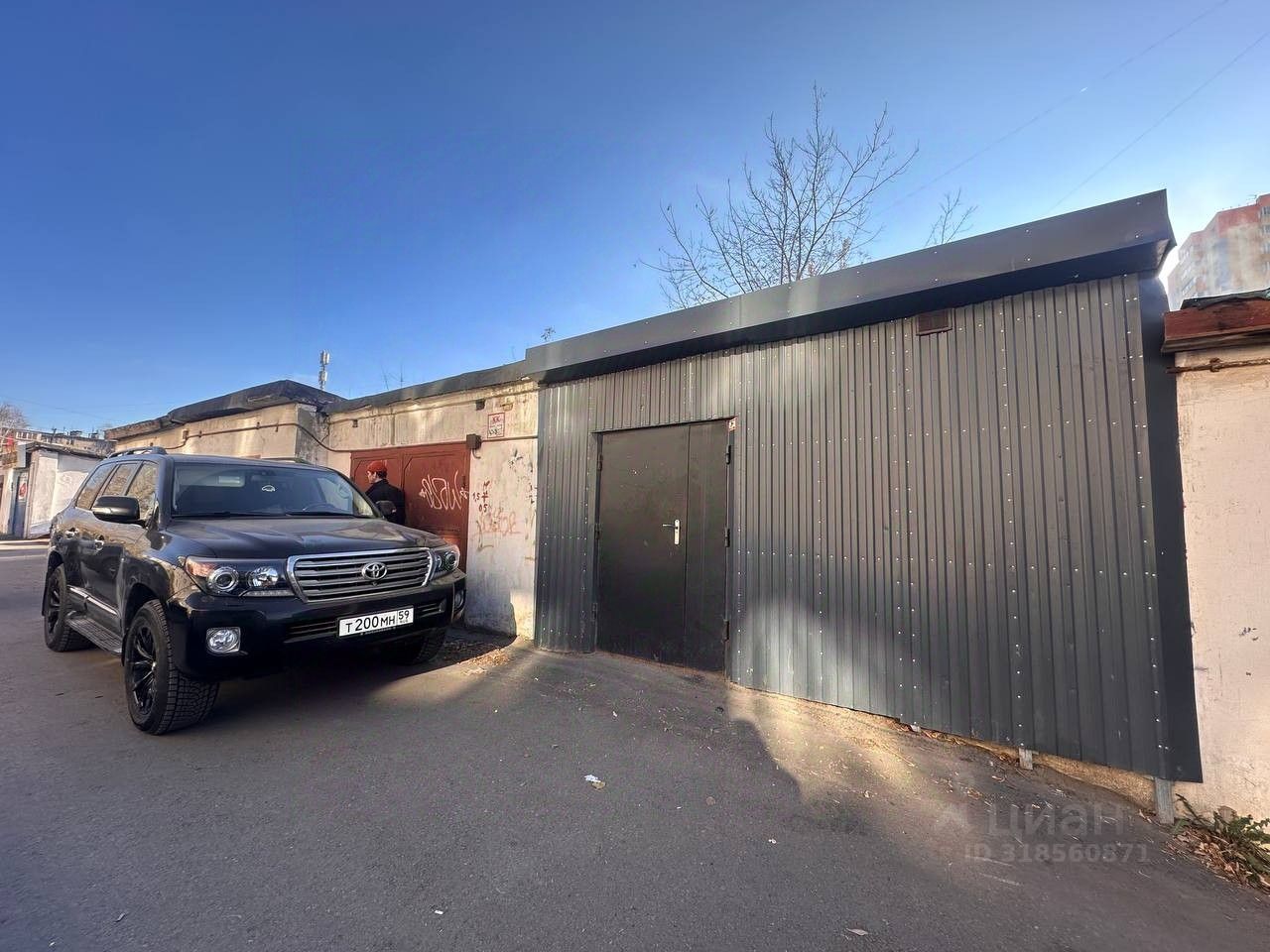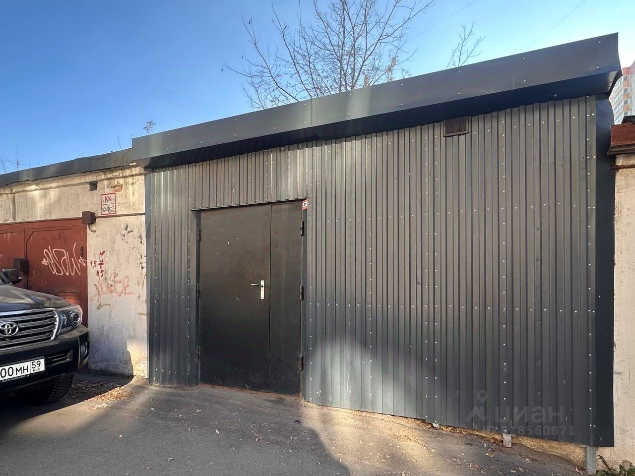 Особенности ремонта и удобства: Гараж представляет собой капитальное строение, с двух сторон облицованное профнастилом темного цвета, который обеспечивает долговечность и защиту от внешних воздействий. Ворота сохранены под обшивкой, в них монтированы металлические двери.