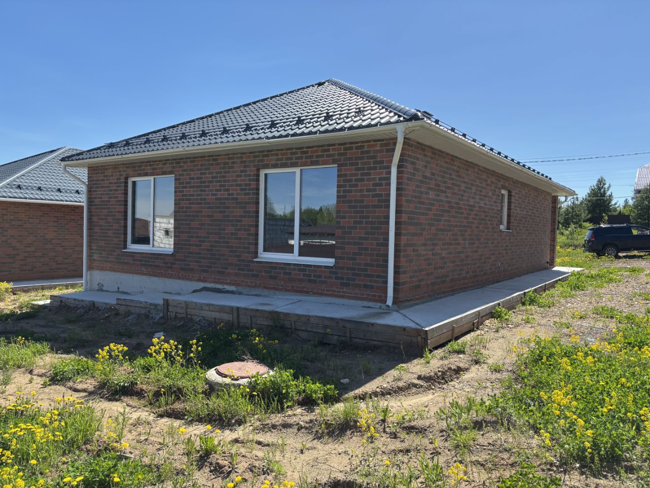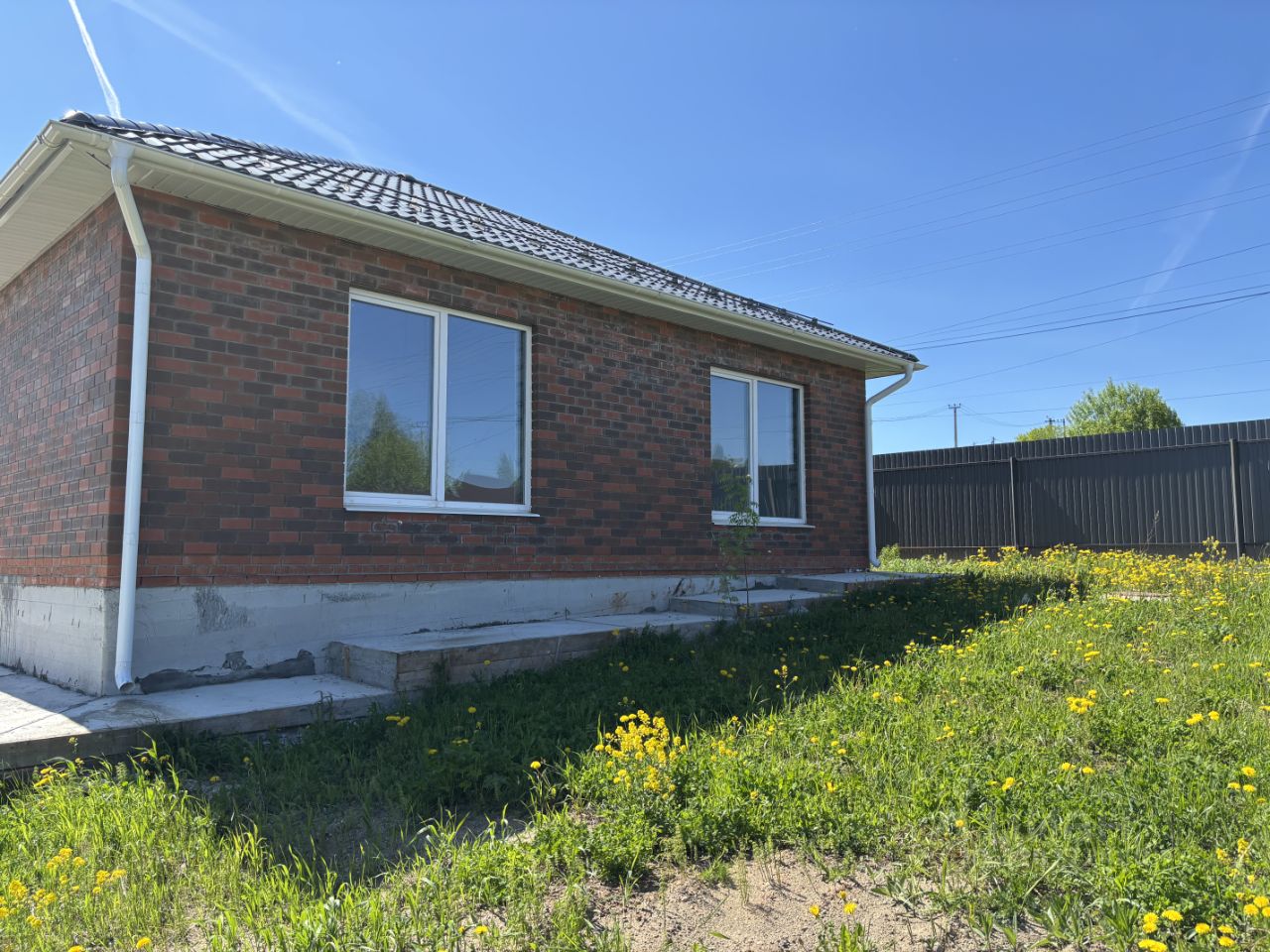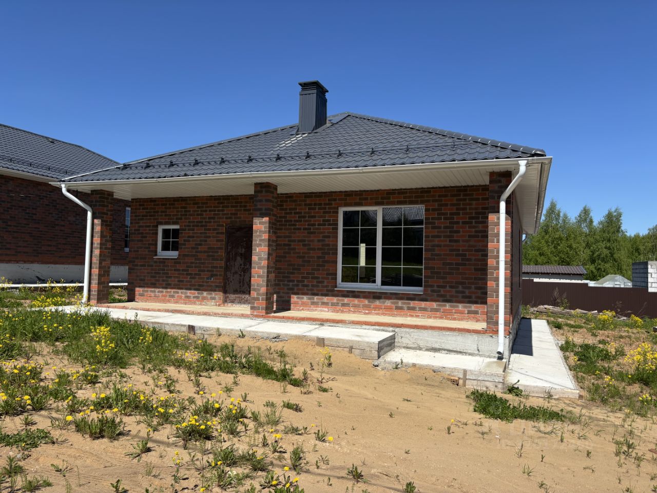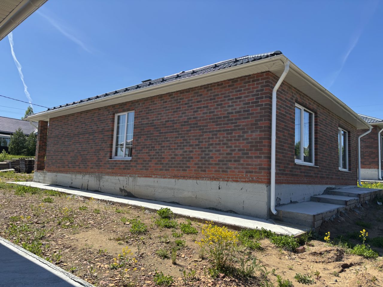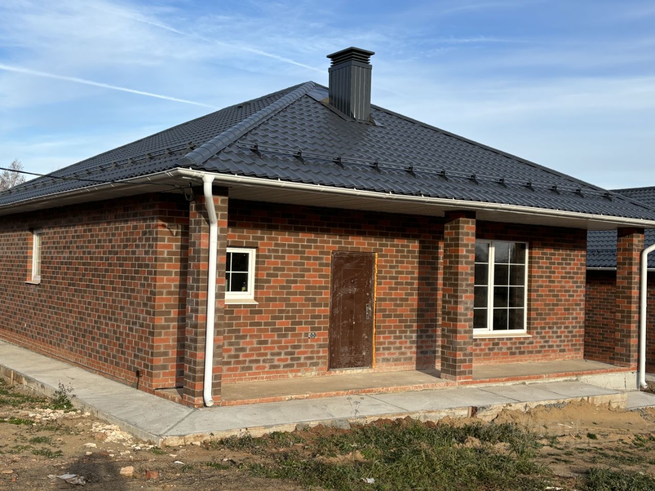 коттедж построен из газоблока, облицован кирпичом, фундамент ленточный на сваях, утепленная жб плита, заводской бетон по ГОСТу, крыша четырехскатная, металлочерепица-серый графит, водосточная система по всему периметру дома, утеплитель базальтовый 200 мм, снегозадержание, установлены подкровельные вентиляторы, сделана отмостка.