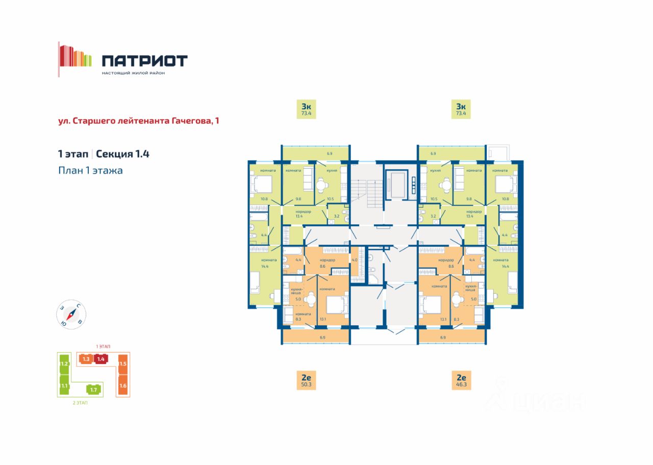 О первом этапе: Адрес: ул. Гачегова, 1.Этажность: 8-10 этажей. Срок сдачи: II кв. 2026 г. - III кв. 2026 г.