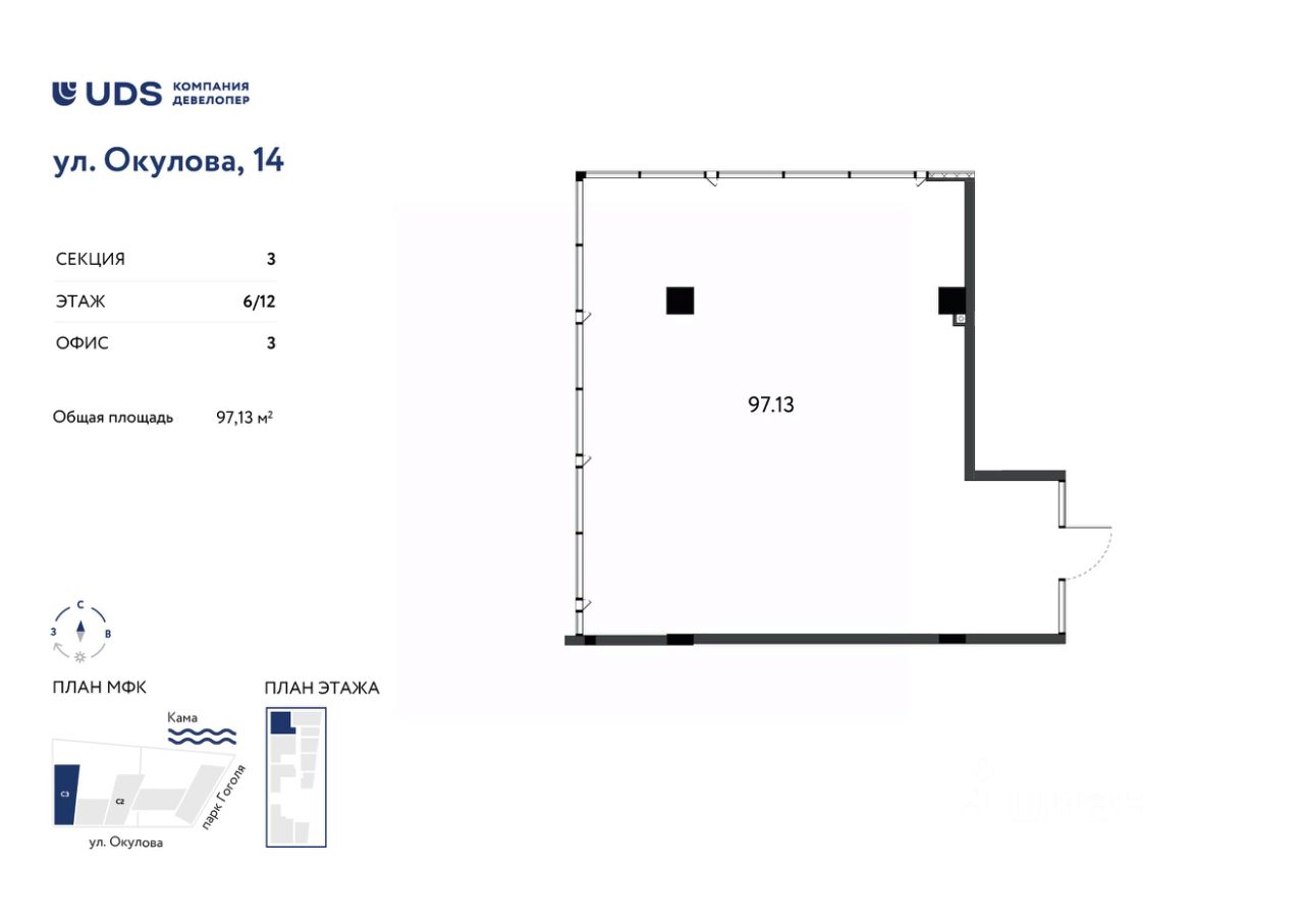 Помещение под офиc 97 м2 с видом на Каму, на 6 этажe МФК Окулова 14 от UDS.