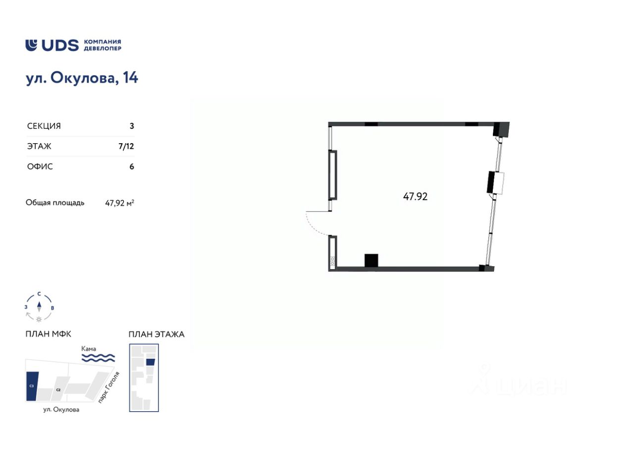 Помещение под офиc 47 м2 на 7 этажe МФК Окулова 14 от UDS.