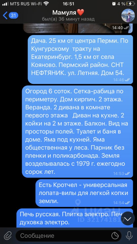 Пермский район. Кояново. СНТ Нефтяник. Дача. Дом кирпич 2 этаж. Крыша железная. 9 спальных мест. Баня и туалет и яма в доме. Огород зарос. 6 соток. Сетка-рабица по периметру огорода. Водопровод в дом из реки. Скважина с родниковой водой в 5 минутах ходьбы от дома. Телевизоры. Печь русская. Дров нет. Самодоставка дров. Электрообогреватель. Электроплита 2 комфор. Электрочайник. Электродуховка.