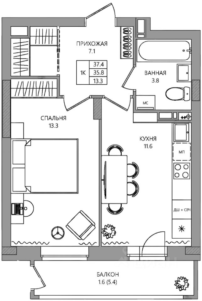 Общая площадь37,4 м2