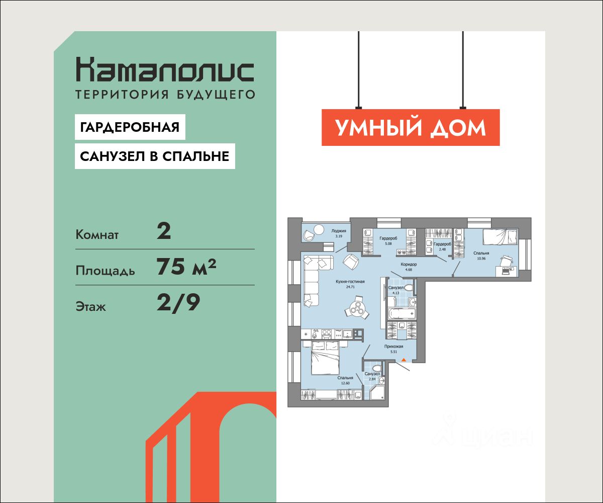 В новом жилом комплексе комфорт+ класса ''Камаполис'', расположенном на берегу реки Камы, продается 2-комнатная квартира площадью 75.00 кв. м. Квартира находится в 4 доме. Девелопер проекта - ''Железно''.