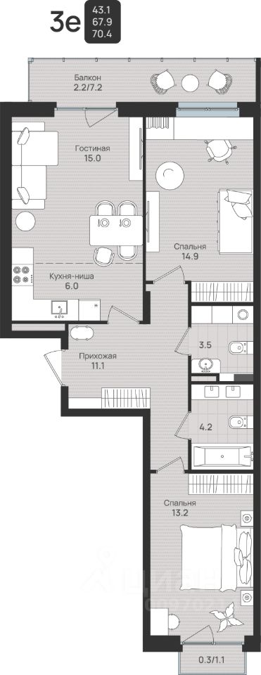 Общая площадь70,4 м2