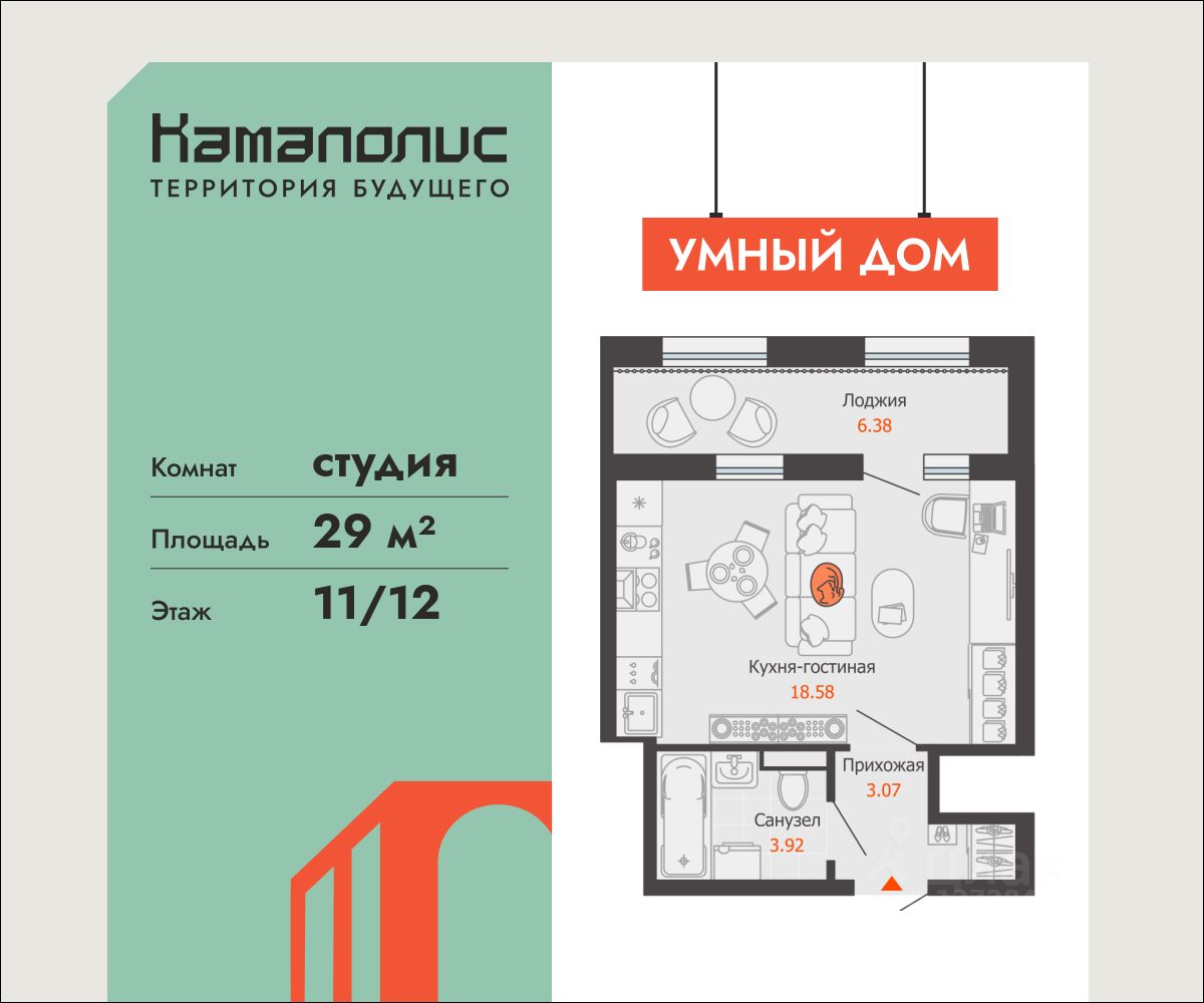 В новом жилом комплексе комфорт+ класса ''Камаполис'', расположенном на берегу реки Камы, продается студия площадью 29.00 кв. м. Квартира находится в 5 (1 этап) доме. Девелопер проекта - ''Железно''.