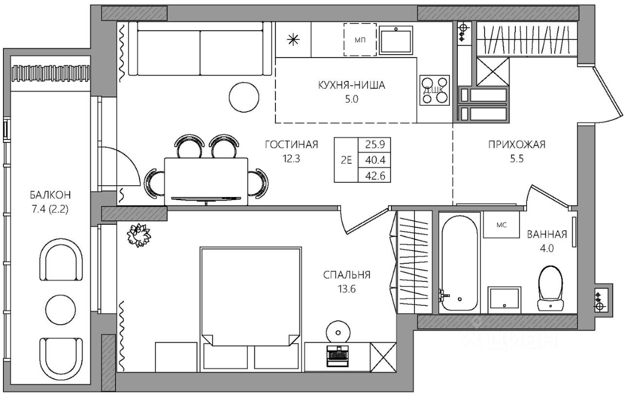 Общая площадь42,6 м2