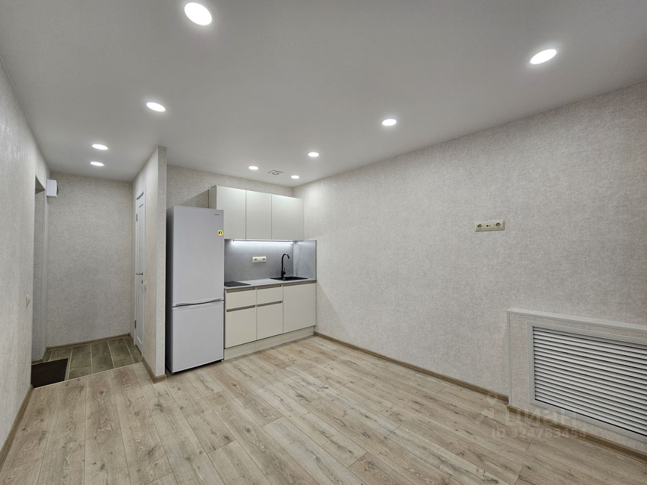 Выделена кухонная зона, куда установлен новый, встроенный кухонный гарнитур с варочной поверхностью и подсветкой, а слева от него оборудовано место для холодильника и сам холодильник.